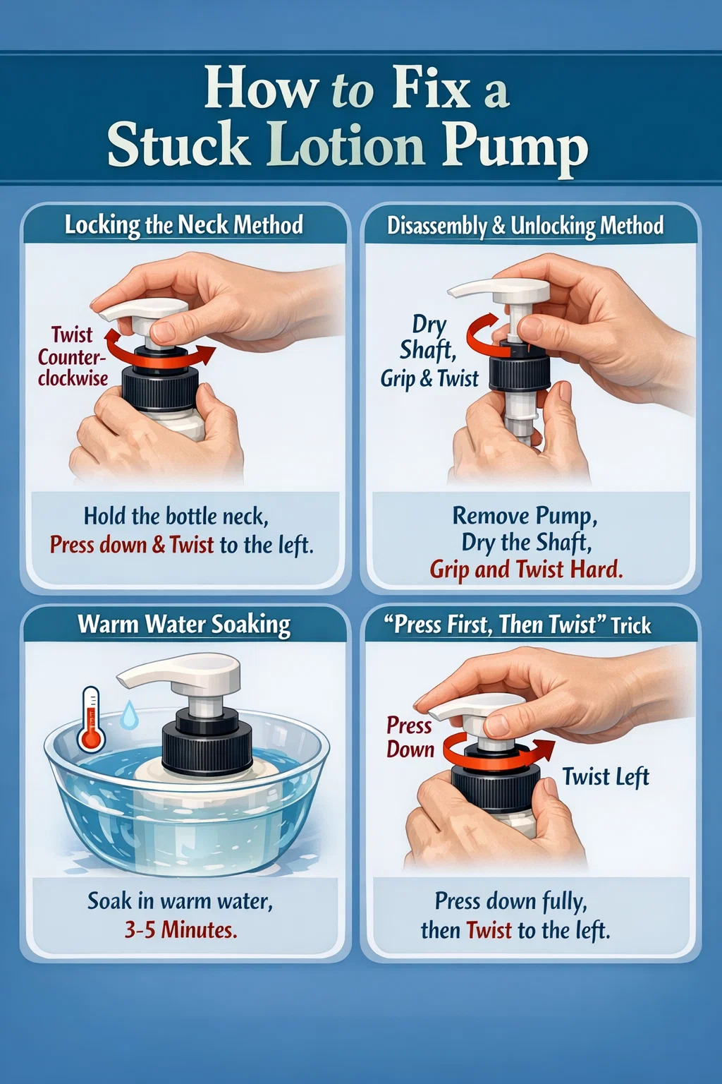 Instruktioner: Lägg hela det avskruvade pumphuvudet i varmt vatten i tre till fem minuter. Varmt vatten kan mjuka upp plasten något och smörja den inre strukturen. Efter blötläggning, torka den och prova rotationsmetoderna som beskrivs ovan igen.