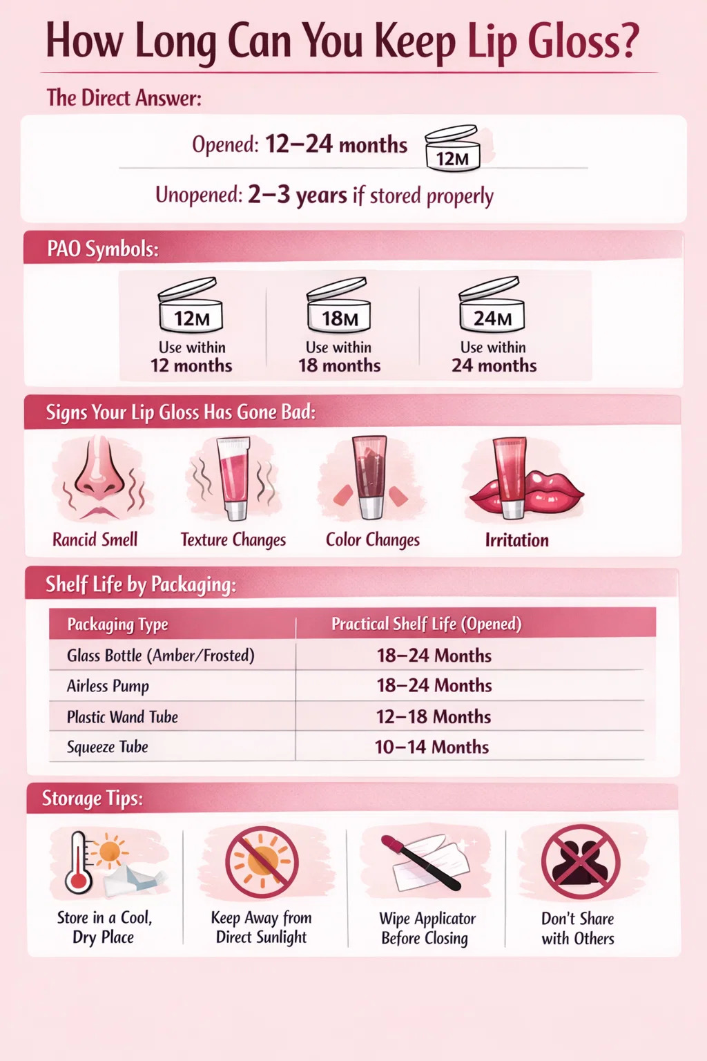 Om ditt läppglans inte har någon PAO-symbol och inget utgångsdatum, är en konservativ allmän riktlinje att byta ut det efter 12 månaders användning. Detta är särskilt viktigt för gloss med applikatorstavar, som doppas direkt i formulan och introducerar bakterier vid varje användning.