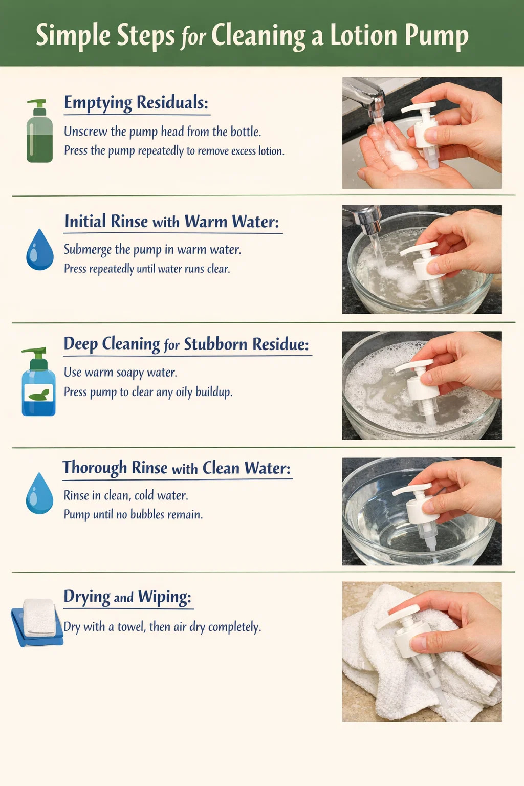 Förbered en bassäng med varmt vatten (använd inte kokande vatten, eftersom det kan deformera plasten). Sänk ner hela lotionpumpen i vattnet, tryck på pumpen flera gånger medan den är nedsänkt. Du kommer att se vit lotion spridas från röret som ett litet moln. Fortsätt att trycka tills endast klart vatten hälls ut.