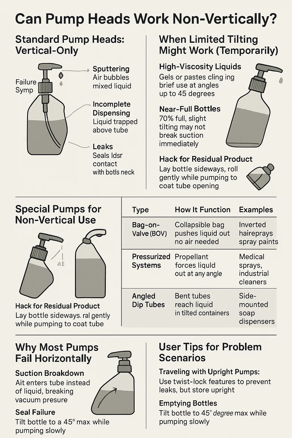 Tyngdkraftsberoende design: Dipberoende design: DIP-rör kräver vätska för att samla i flaskans botten. Lutning avbryter sug, orsakar luftintag eller torrpumpning.