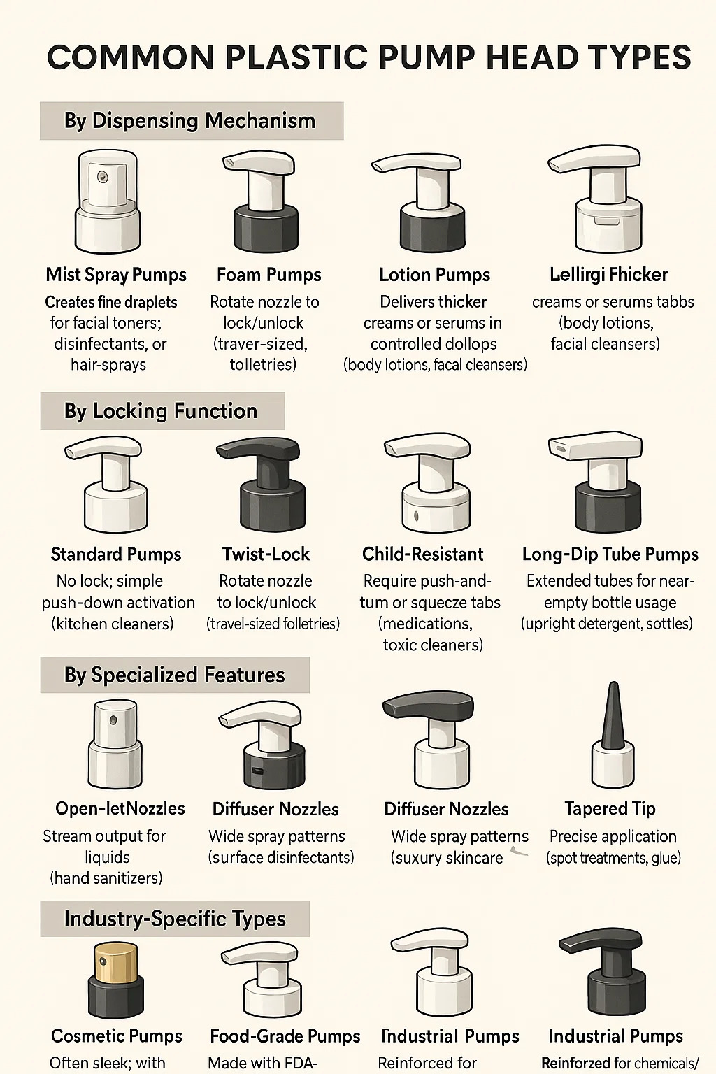 Här är en uppdelning av vanliga plastpumphuvud Typer baserade på deras funktionella mönster och applikationer: